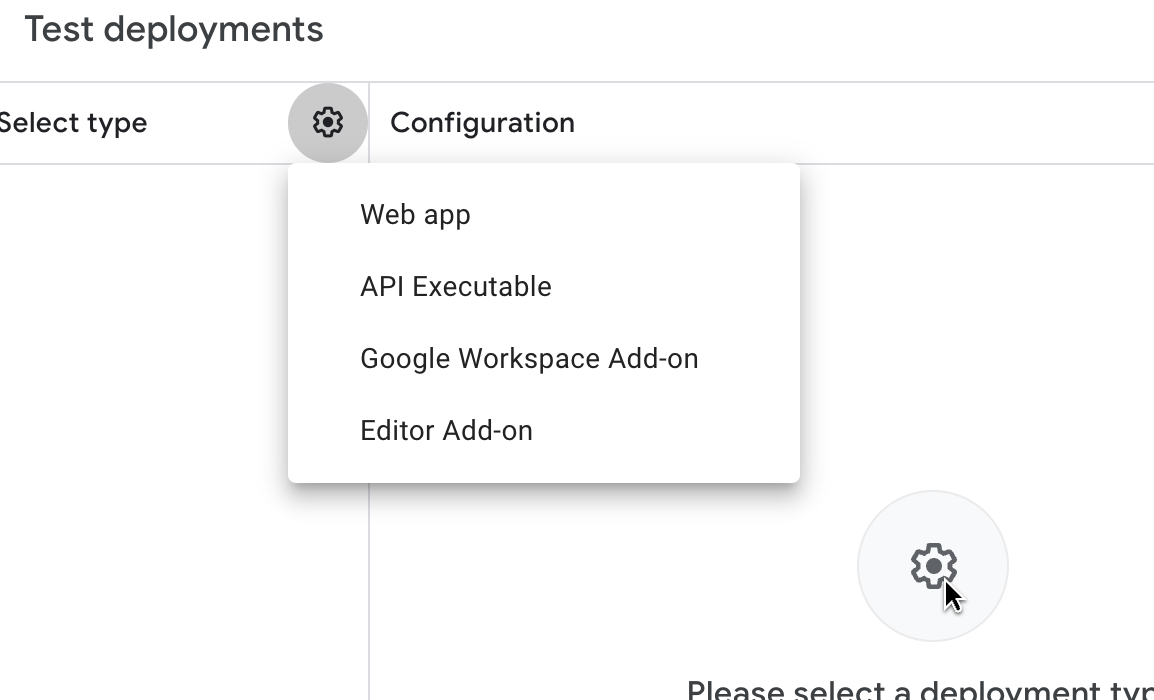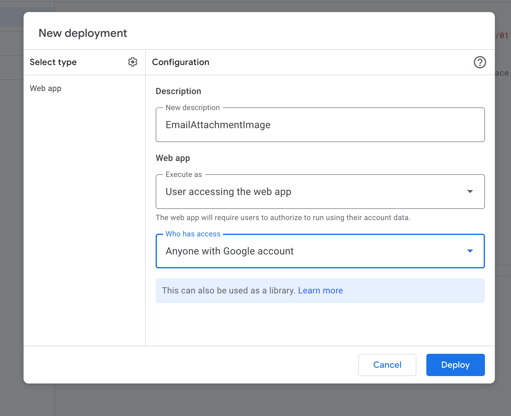Finally, click on Deploy, select New Deployment, and under the settings (gear icon), choose Web App to deploy the script.