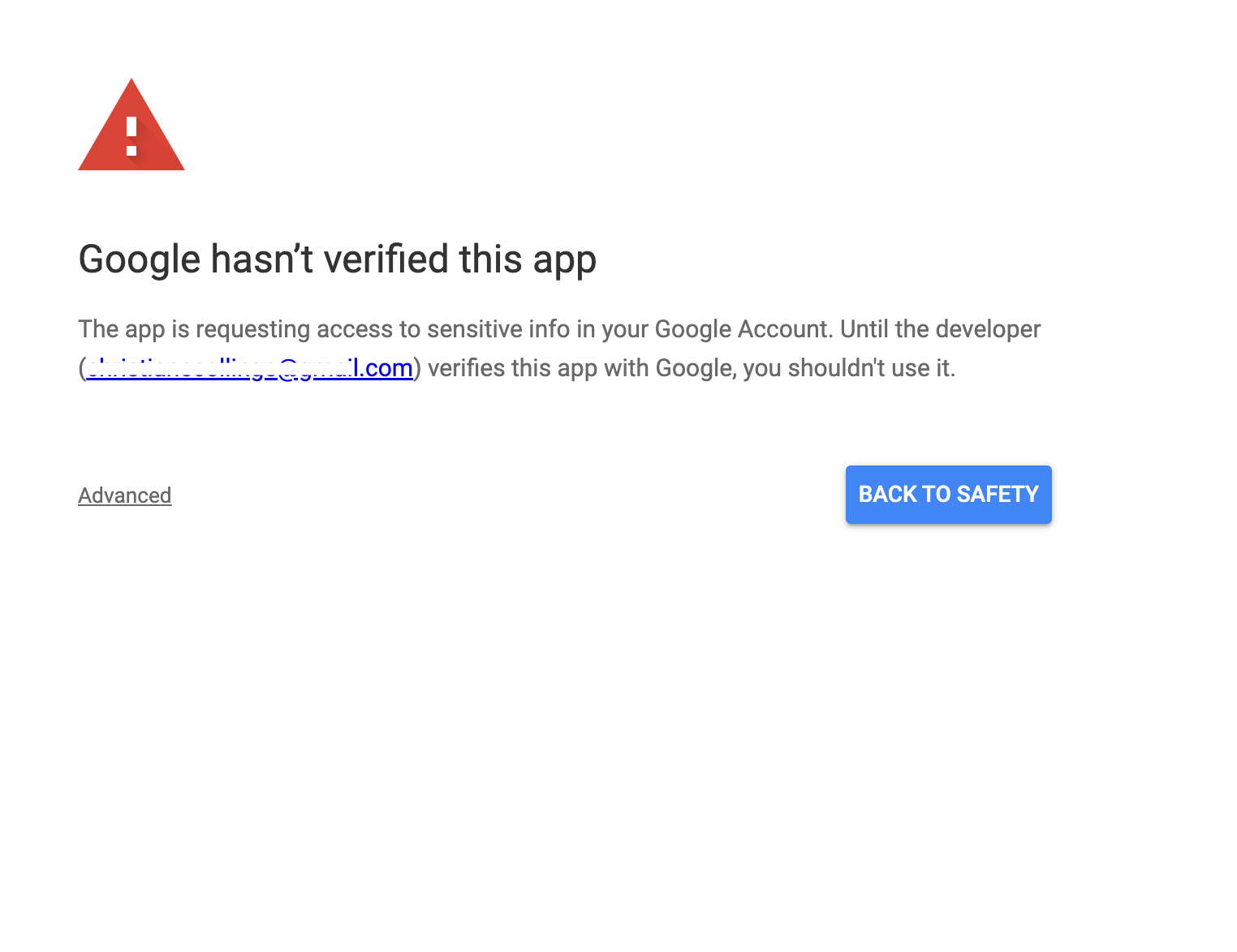 This warning only appears because the app has not gone through the Google verification process but is safe to use since you’re the developer and know what the app does.